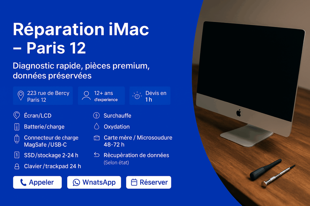 • Carte mère / microsoudure / GPU : Mac qui ne s’allume plus, courts-circuits, artefacts vidéo. Délai moyen : 48–72 h après diagnostic.